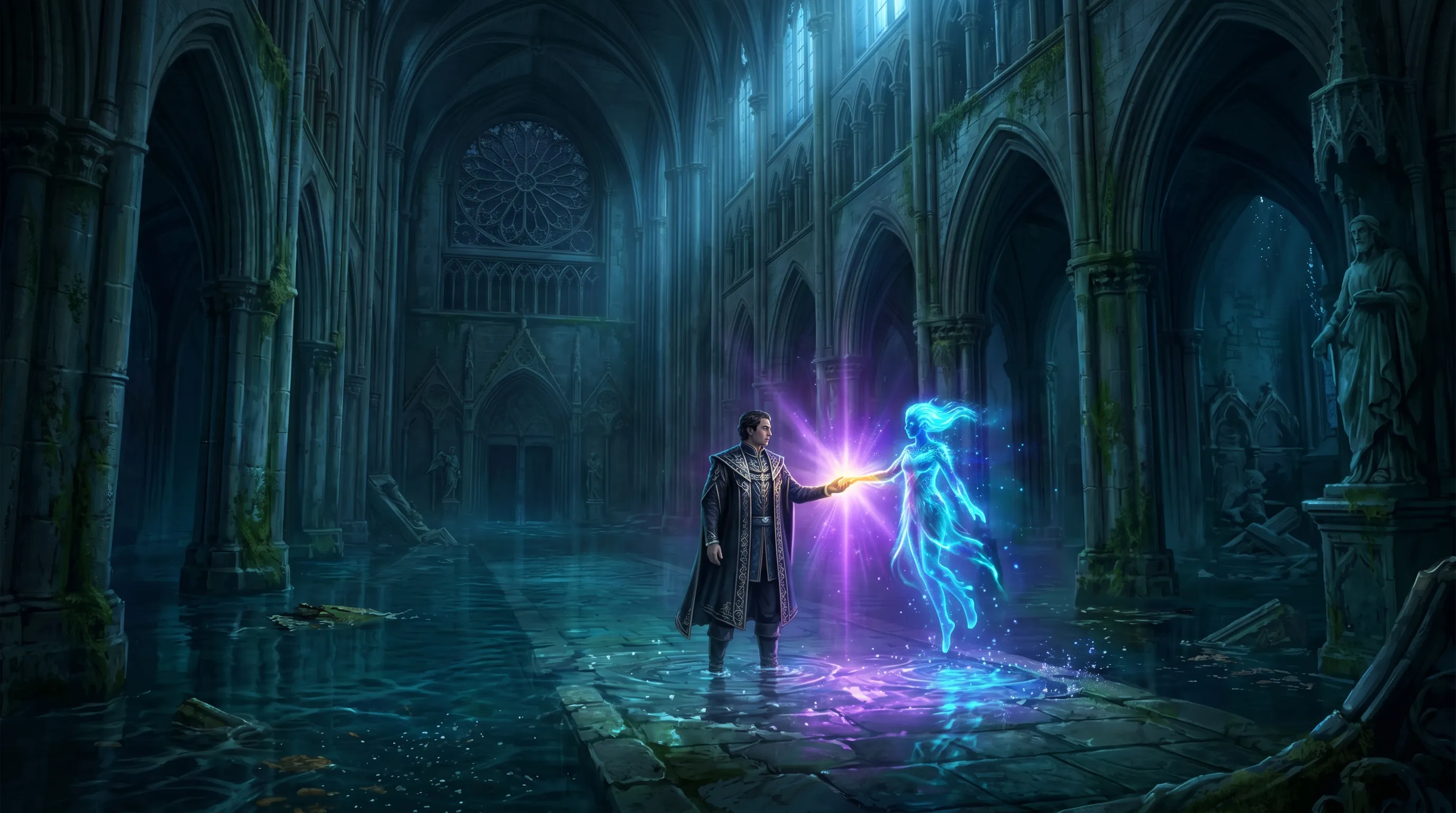 👁️ 画面:水下教堂中,贵族与发光体牵手,交汇处迸发出紫金色光芒。完美呈现“禁忌与新生”。
