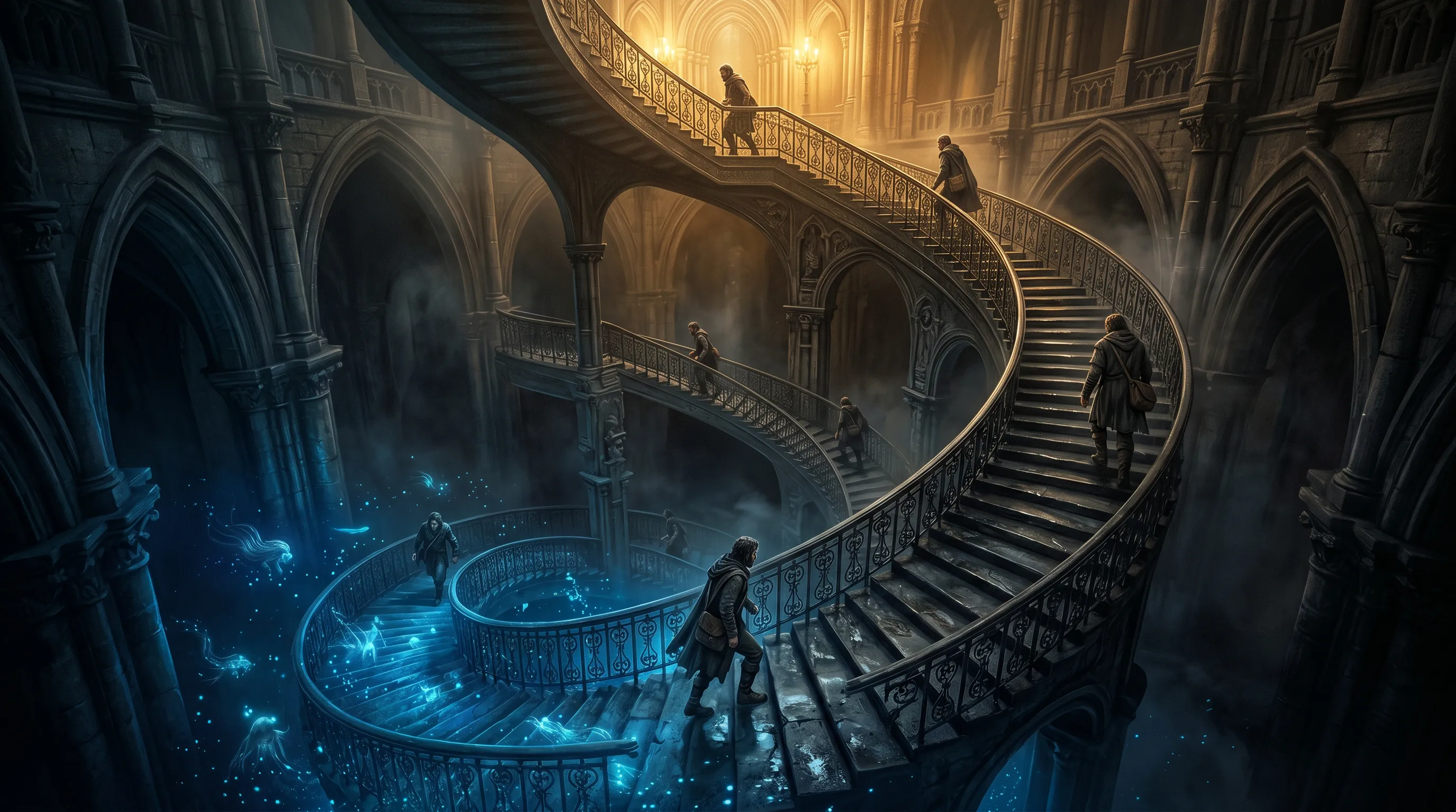 - 👁️ 画面:螺旋阶梯连接深渊蓝光与顶层金光,呈现出莫比乌斯环般的无限循环。精准表达“阶级固化与宿命”。