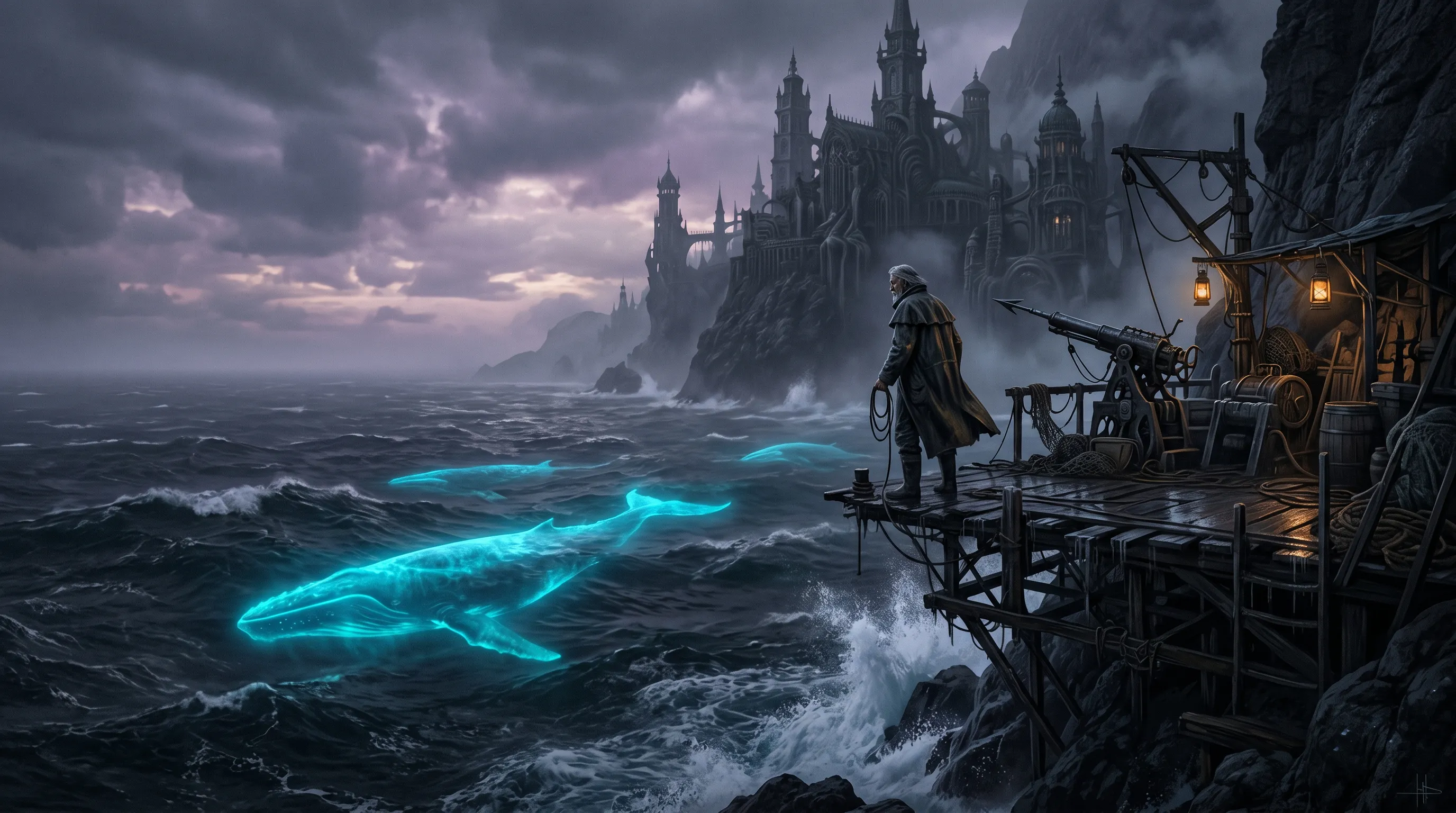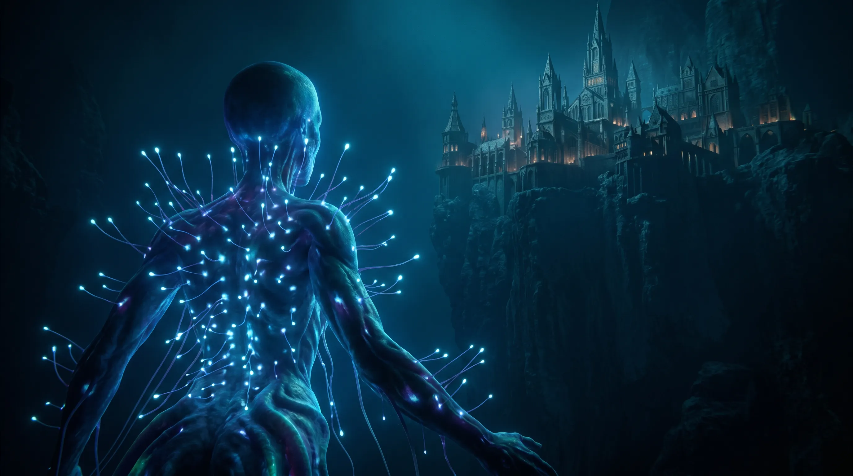 深海中,一个巨大的类人古神轮廓矗立,背后延伸出无数如神经元突触般发光的触须,每一根都指向悬崖上的 Hydra 城。远方的哥特式尖塔建筑群散发出温暖的琥珀色光芒,与深海的冷蓝形成强烈对比。完全符合“过肩视角 + 神经突触连接”的设定。