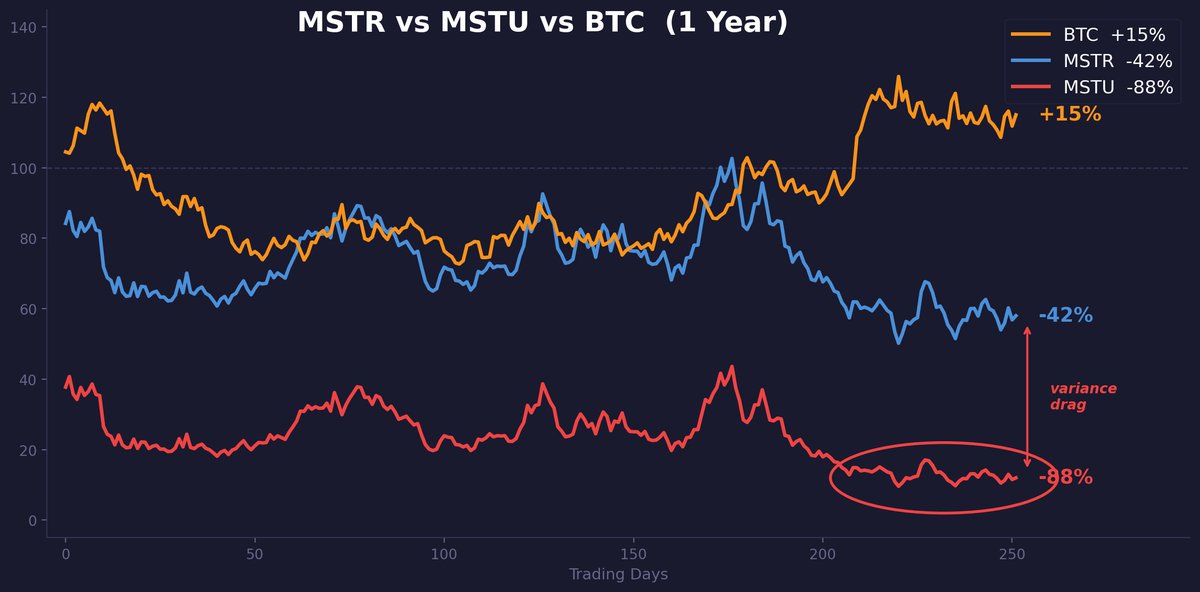 过去一年里,MSTR 大约下跌了 42%,而 btc 实际上涨了 15%。MSTU 并没有下跌 84%,而是下跌了 88%。