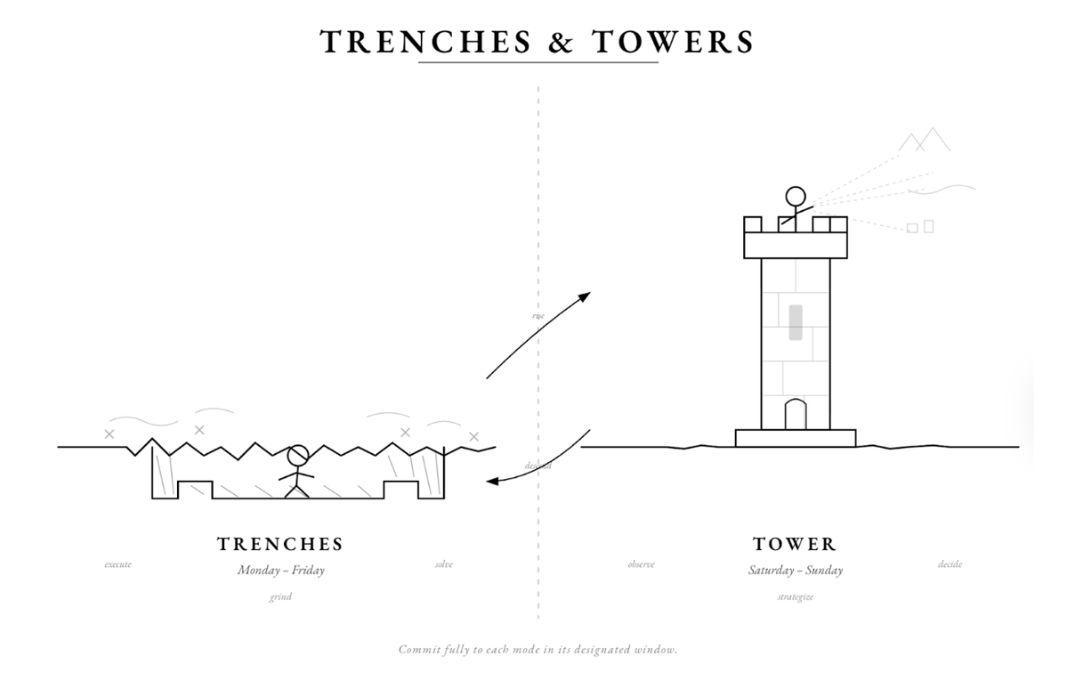 There’s a concept called “Trenches & Towers” which I personally live by and will write about in the future. During the week, you're in the trenches of your business: head down, executing, grinding, solving problems at ground level. On the weekend, you climb the tower: you zoom out, see the whole map, and strategize on where the next moves should be. This separation is the point.
