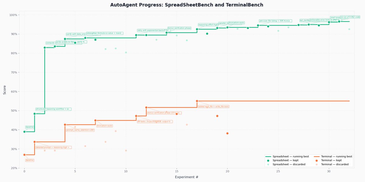 AutoAgent hit both the #1 on SpreadsheetBench (96.5%) and the #1 GPT-5 score on TerminalBench (55.1%) after optimizing for 24+ hours