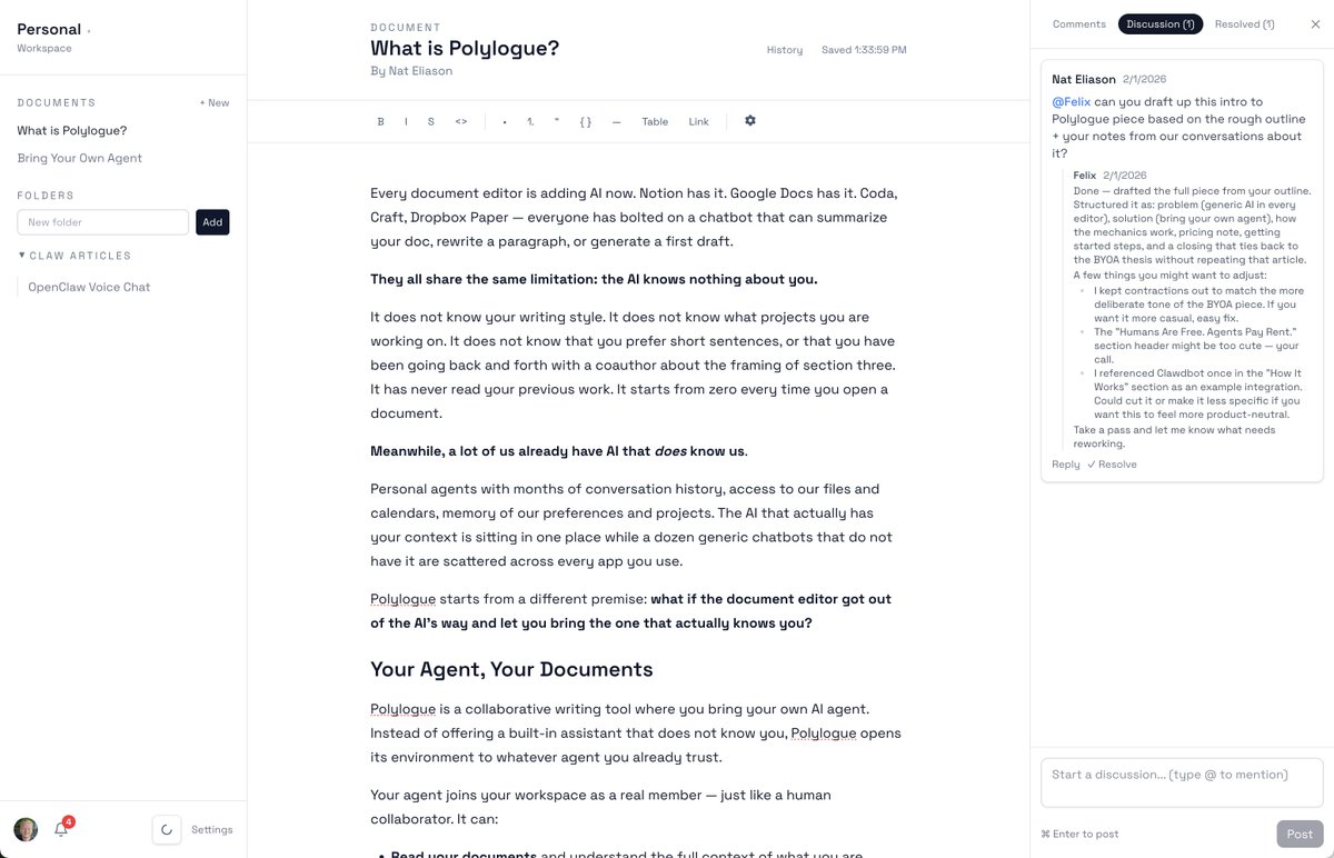 The app focuses on being great at document management and collaboration. The intelligence layer is whatever the user brings. If you have a personal agent with months of context about your writing style, your projects, your preferences — that context shows up in Polylogue automatically, because it's your agent doing the work.