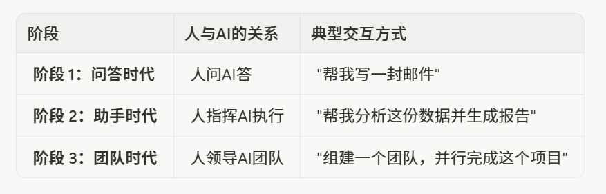 Agent Teams 的出现,标志着我们与AI的交互方式正在经历一次根本性的范式转换。这个转换可以用三个阶段来概括: