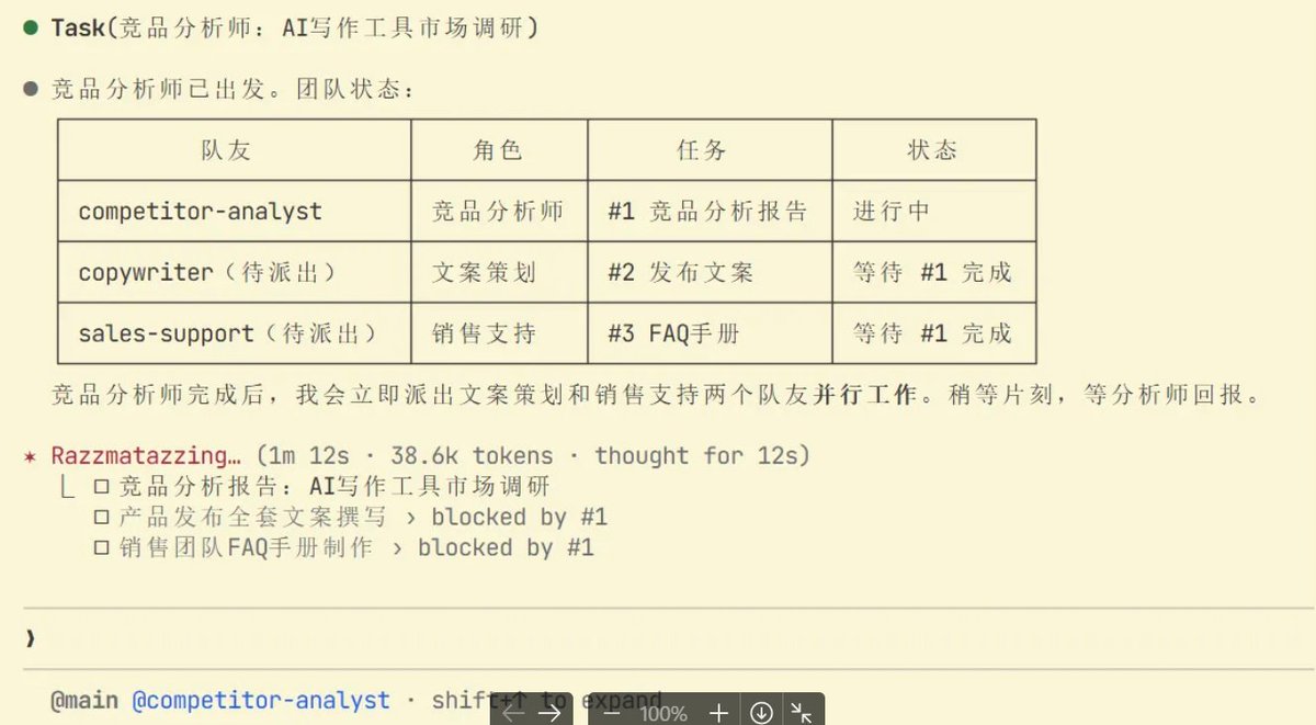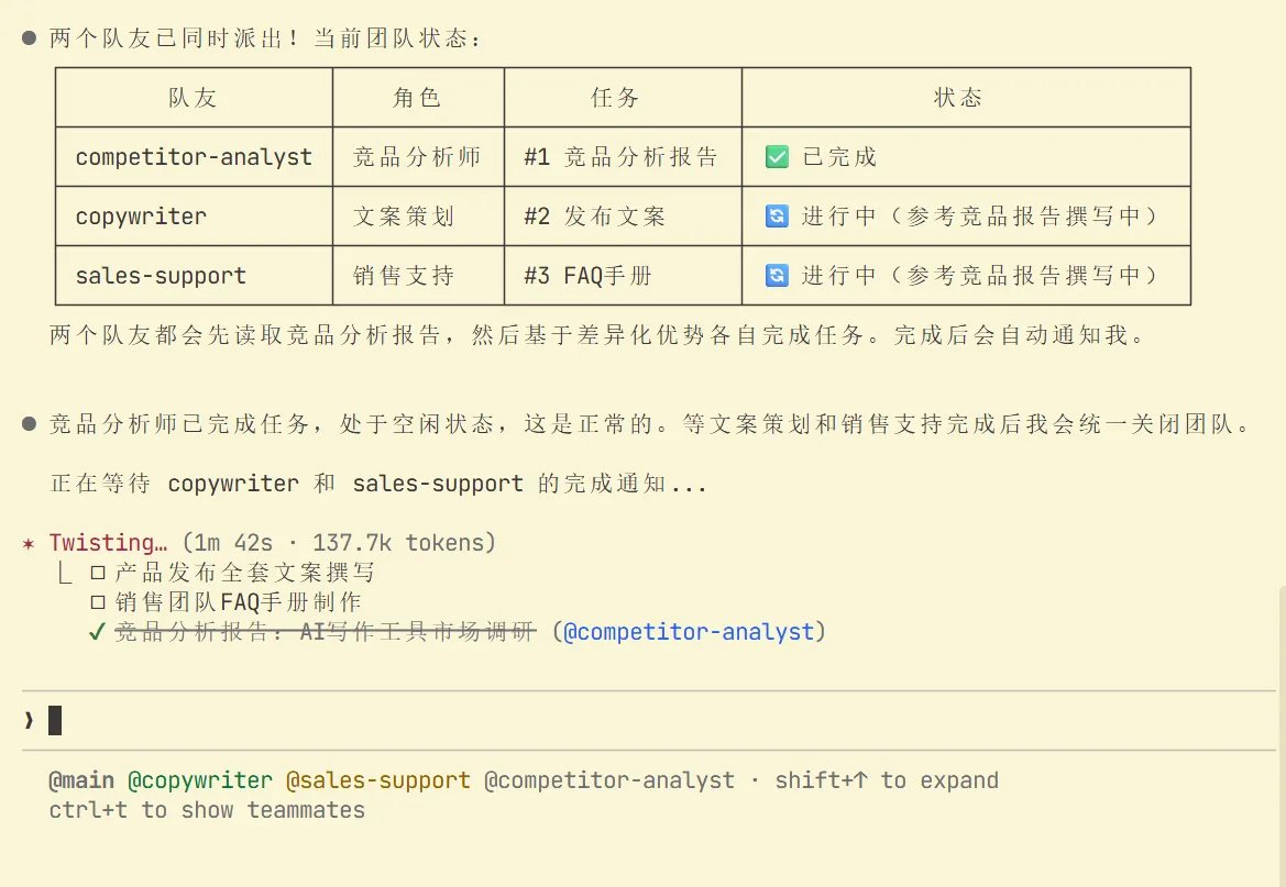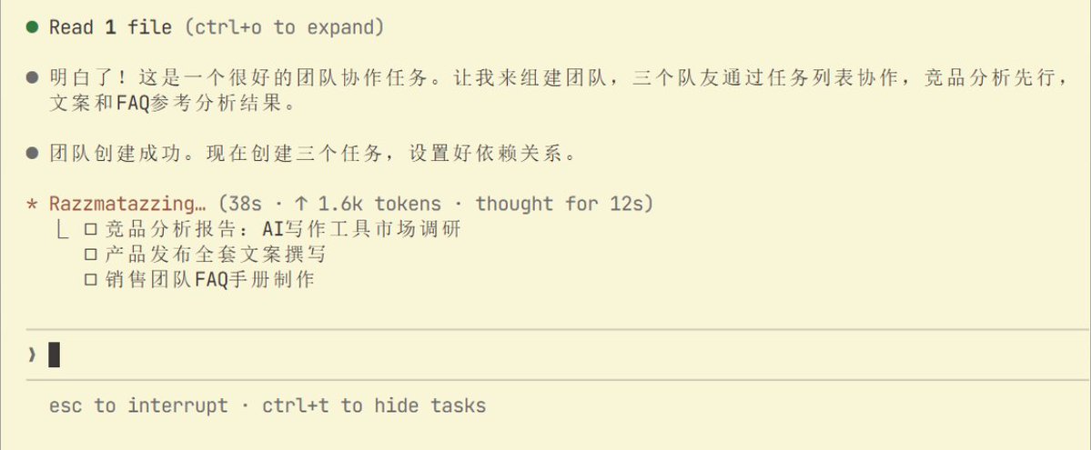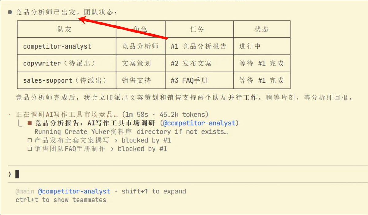 1️⃣ 组建团队:Claude 自动成为队长,并且生成3个独立的队友