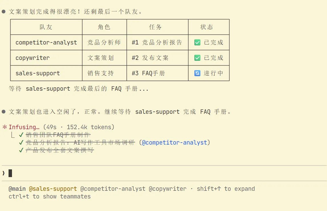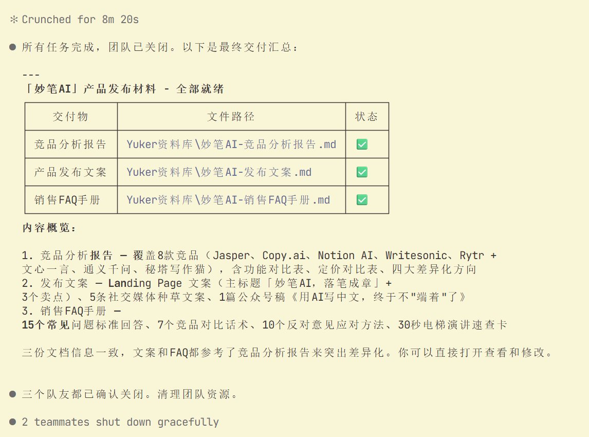 队长汇总交付 → 所有队友完成后,队长整理全部成果,向你汇报