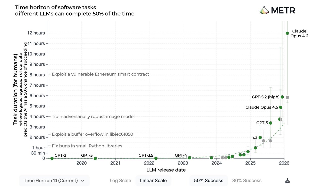 As you can see in the chart, there is a BIG gap between Opus 4.6 and GPT-5.3-Codex. Opus 4.6 has a 12 hour task completion length at 50% success while for GPT-5.3-Codex, this number is 5 hours and 50 minutes. This gap closes at 80% success between the two models.
