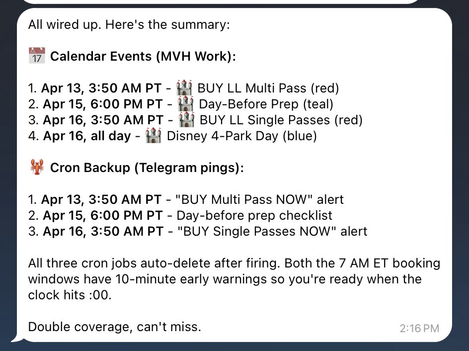 Step 6: 通过 Telegram 把 .md 文件丢进 OpenClaw。然后说:"can you make a plan to add all these reminders to YOU with dobel safeties in case you mess up day before / calendar etc." OpenClaw 读了 plan,在我的工作日历里建了日程事件,同时加了 cron job 备份,用 Telegram 给我推送。每个关键预订窗口都有双保险。Apr 13 at 3:50 AM PT: "BUY Multi Pass NOW." Apr 16 at 3:50 AM: "BUY Single Passes NOW." 都是在 7 AM ET 窗口开启前 10 分钟提醒。触发后自动删除。