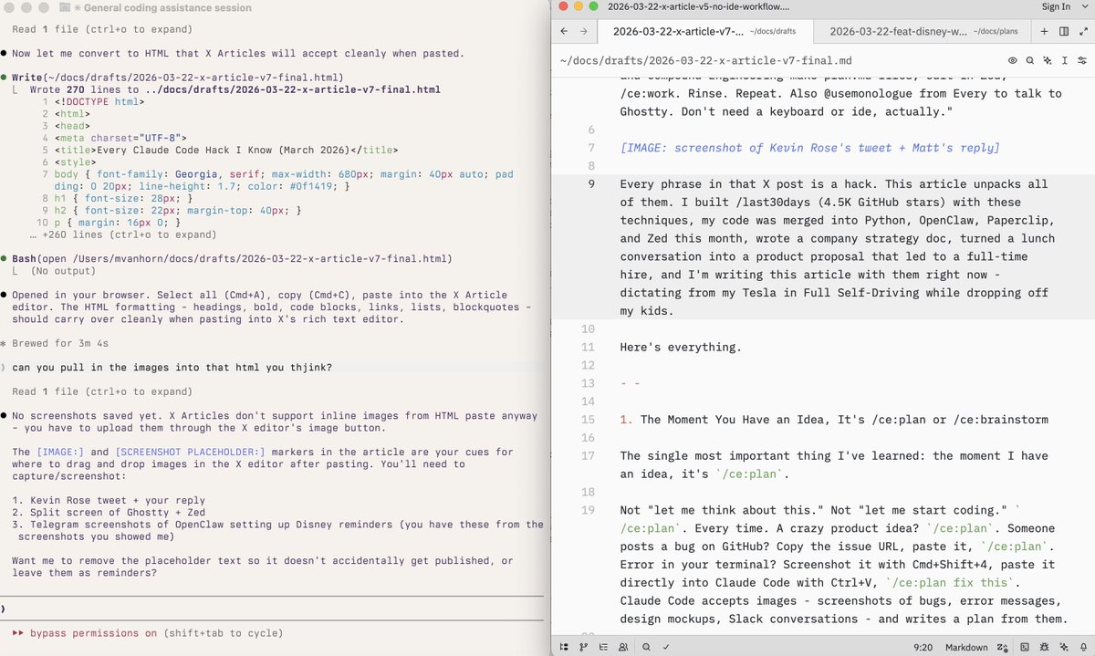 这招有点像 Google Docs。Zed 每 500 毫秒保存一次。Claude Code 会盯着文件系统。Claude 改了文件,Zed 里立刻出现变化;你在 Zed 里打字,Claude 一秒内就能看到。Ghostty 一半屏,Zed 另一半屏,都盯着同一个文件。感觉就像在 Google Doc 里协作,只不过其中一个协作者是 AI。