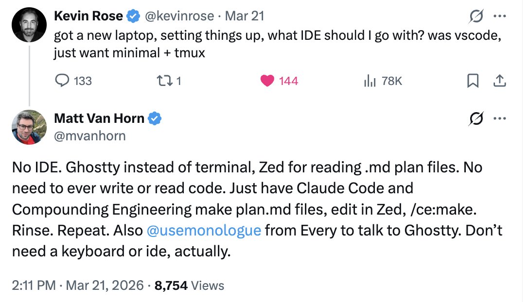 @kevinrose 问该用什么 IDE。在 128 个回答里,我这句互动最高:不要 IDE。只要 plan.md 文件和语音。下面就是我这句话的全部意思。