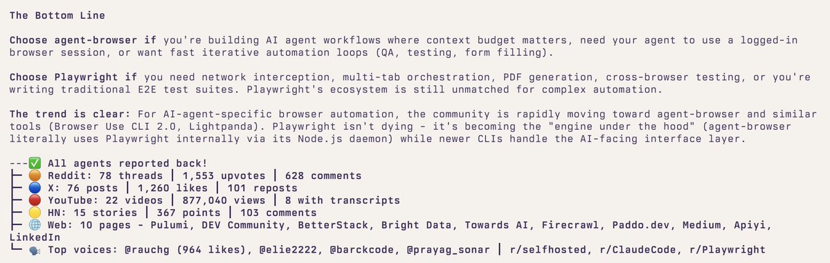 我当时在 Vercel 的 agent-browser 和 Playwright 之间犹豫。与其啃文档,不如直接跑 /last30days Vercel agent browser vs Playwright。几分钟内就出来了:78 个 Reddit 线程、76 条 X 帖子、22 个 YouTube 视频、15 个 HN 帖子。agent-browser 用的上下文 token 少 82-93%。Playwright 光工具定义就要塞 13,700 个 token。@rauchg 的那条帖子拿了 964 个赞。