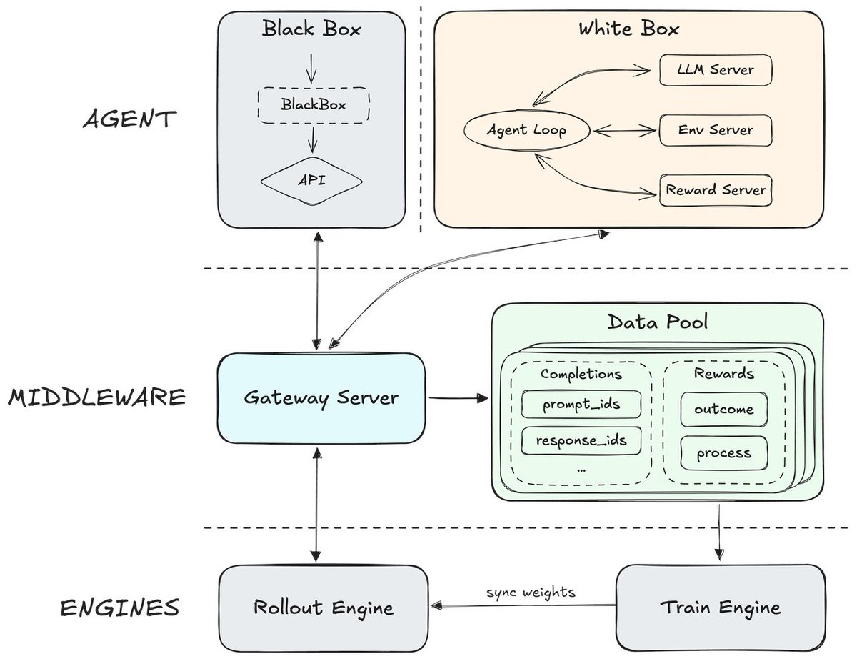 Agent Side: This layer abstracts the General Agent—comprising both white-box and black-box architectures—and its operational environment. It orchestrates recursive environmental interactions, allowing the Agent to function as a pure trajectory producer. By decoupling environmental feedback from system overhead, the Agent can focus exclusively on core business logic (such as Context Management and Reasoning Chains), remaining agnostic to the underlying training and inference mechanics.