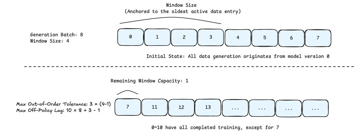 Restricted Visibility Scope: Let the generation queue be denoted as Q=[T0,T1,...,TN−1], with the current head at index i. The Training Scheduler is strictly limited to fetching completed trajectories from the range [Ti,Ti+W−1].