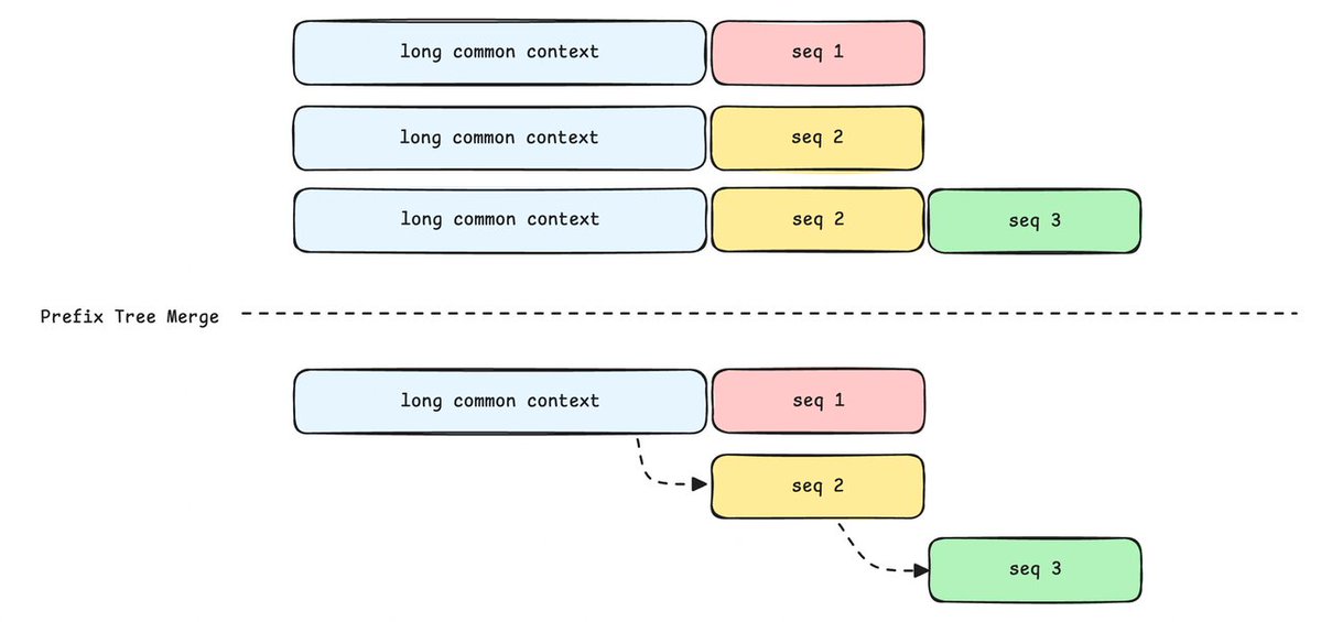 Prefix Tree Merge: Addressing the complex context management in Agent scenarios (as illustrated by the "long common context"), multiple completions can be merged into a single prefix tree at the sample level—even if subsequent responses differ slightly or belong to different sampling branches—provided they share an underlying prefix.