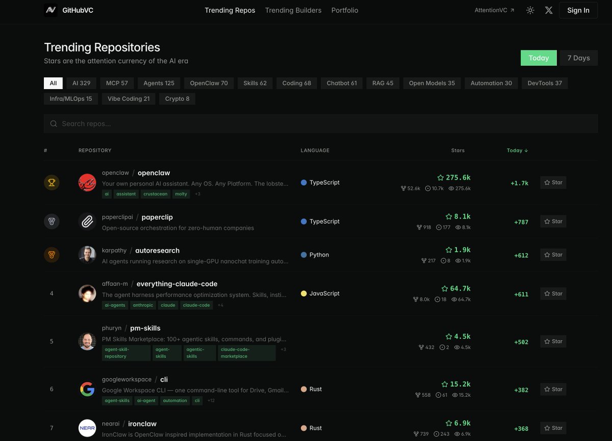 Meanwhile, @openclaw just crossed 275,000 stars, gaining 2,870 in a single day — overtaking long-standing giants to claim one of the most-starred spots on all of GitHub.