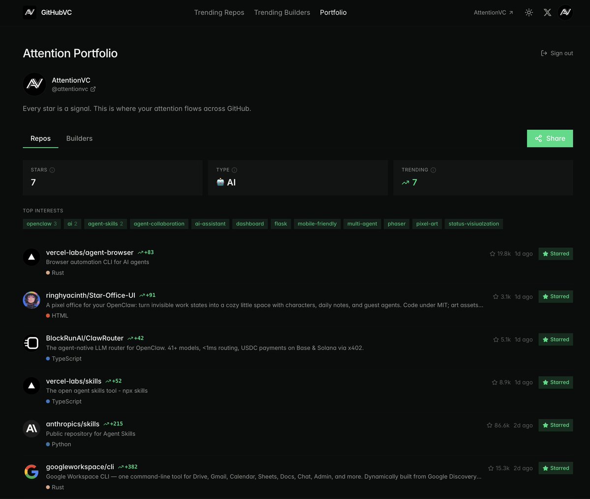 Come build your portfolio. Stake your attention on the next 200k-star repo. Leave traces of trust that compound forever.