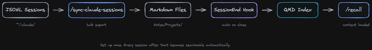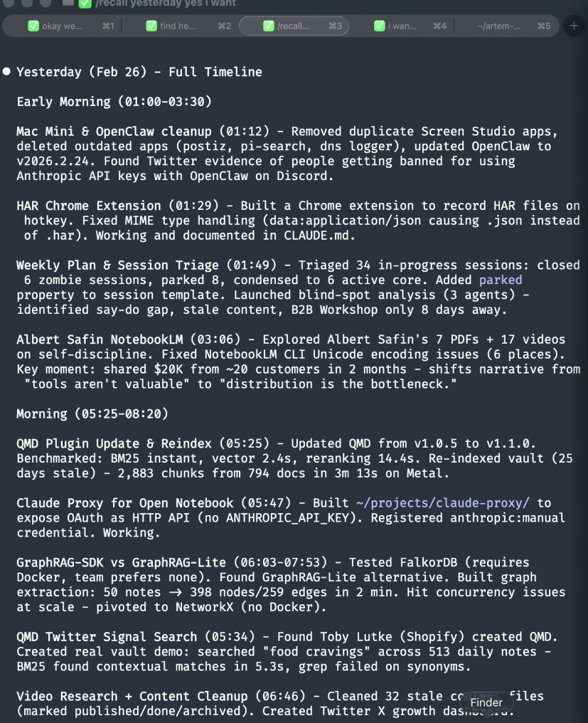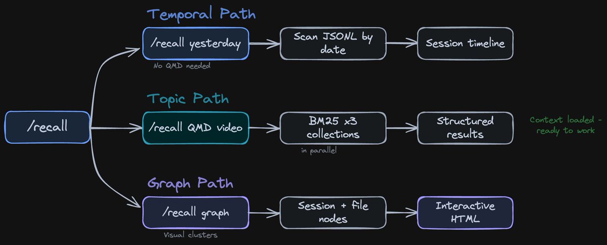 /recall is a Claude Code skill that sits on top of QMD. It loads context before you start working - instead of explaining to Claude what you were doing, you tell it to recall.
