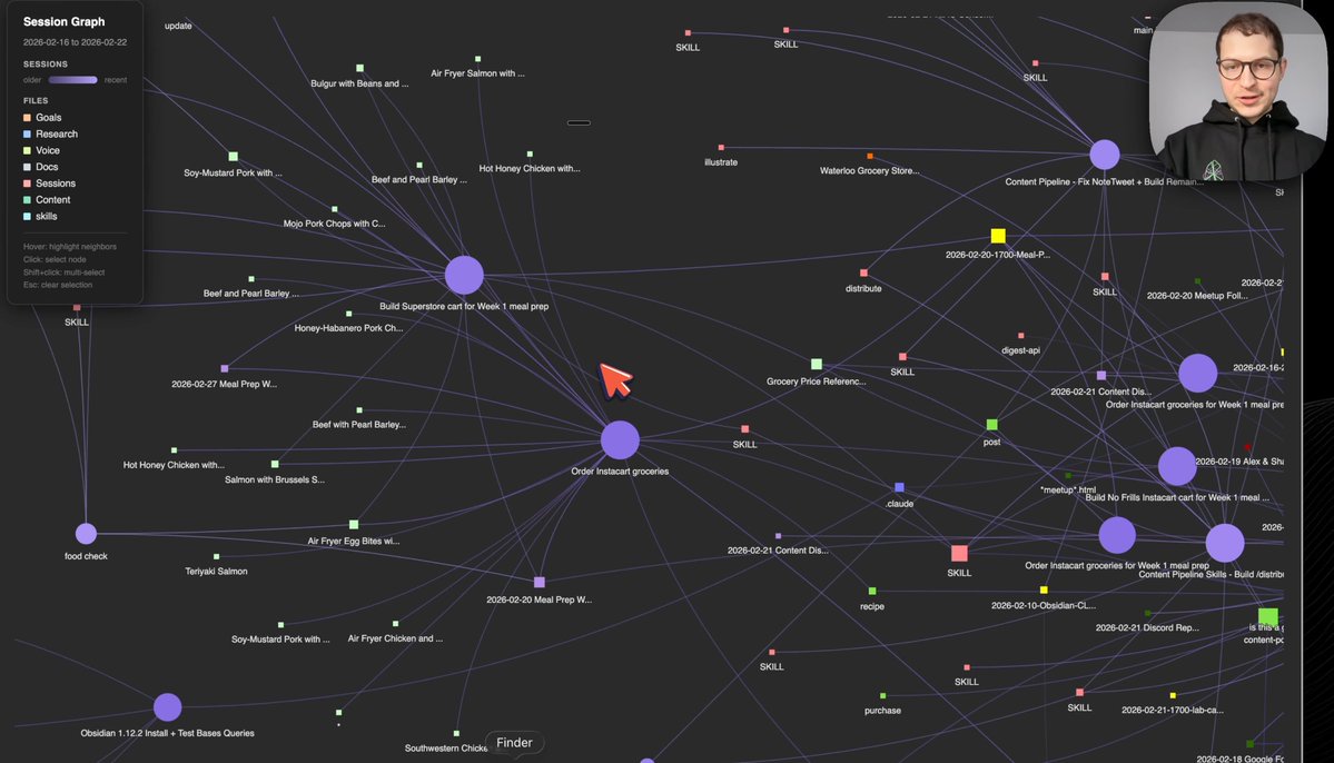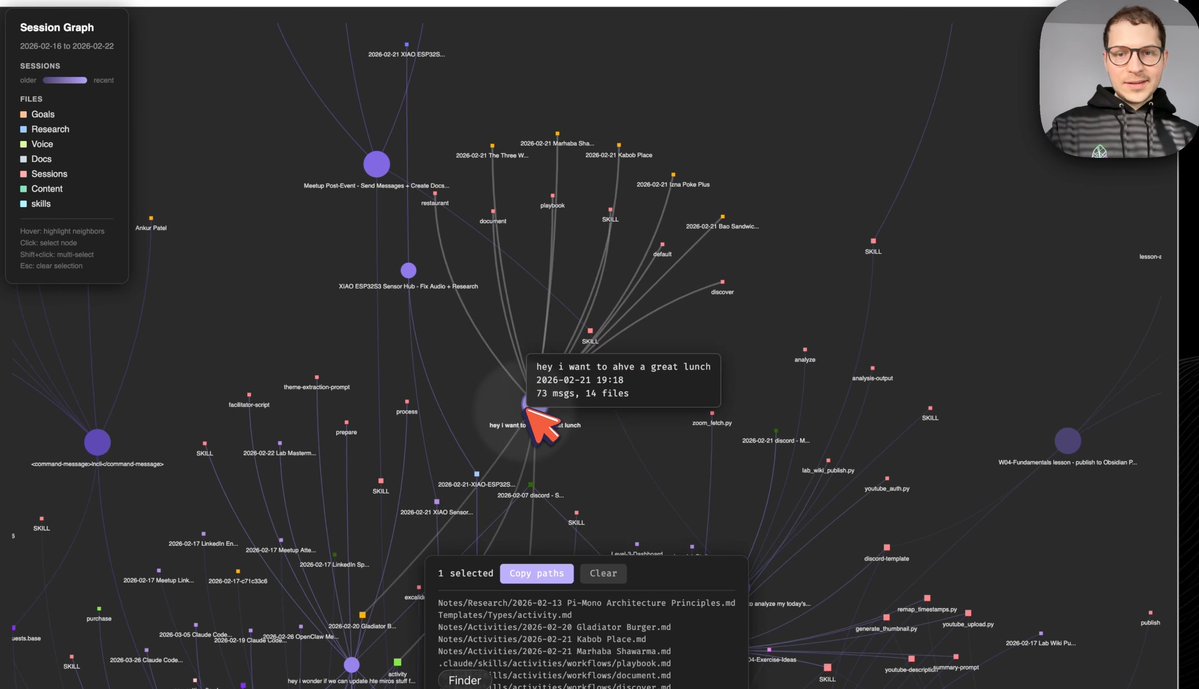 Graph opened an interactive visualization of my whole week. Sessions as colored blobs, older ones dimmer, recent ones highlighted in purple. Files clustered by type: goals, research, voice, docs, content, skills.