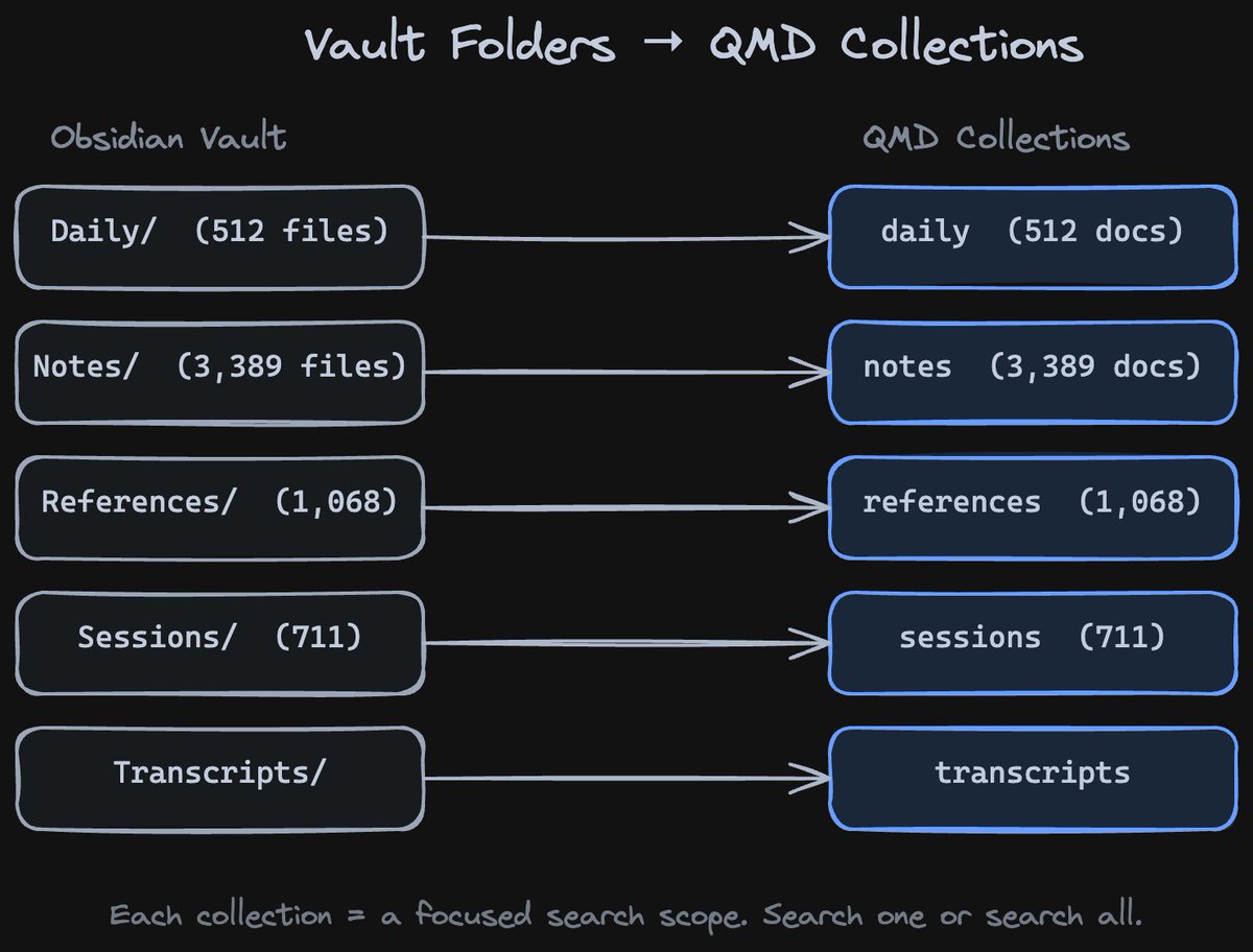 For each vault folder I have a QMD collection. Notes, daily entries, sessions, transcripts. One-to-one mapping. For each collection I can perform a focused search.