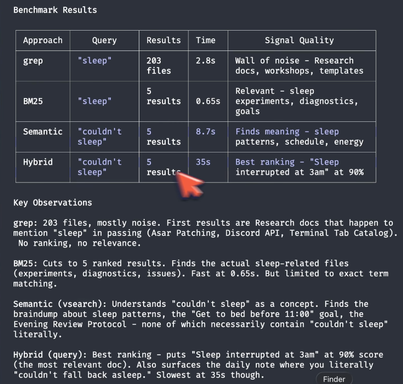 Semantic search: I type qmd vsearch "couldn't sleep, bad night" and it found a bedtime discipline goal I set years ago. It goes beyond the keywords and explores the meaning. Four of five results don't contain the search words at all. Grep could never find them.