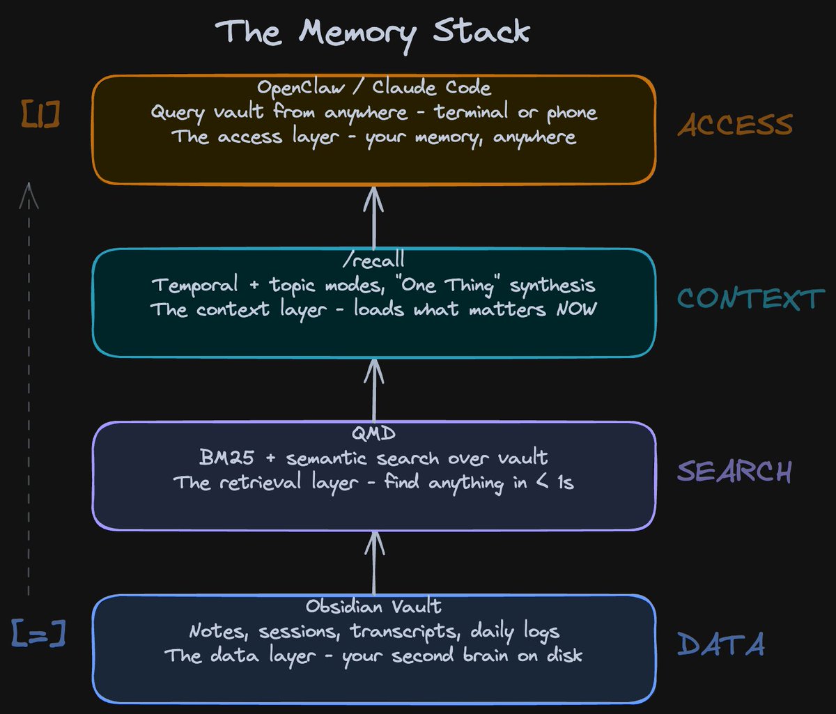 The memory layer works as a skill across your whole stack. I use Obsidian Sync to keep my vault in sync between my Mac and a Mac Mini that's always on. On the Mac Mini, OpenClaw runs 24/7. So I pick up my phone, open OpenClaw, and I have the same vault, same QMD index, same skills - from anywhere.