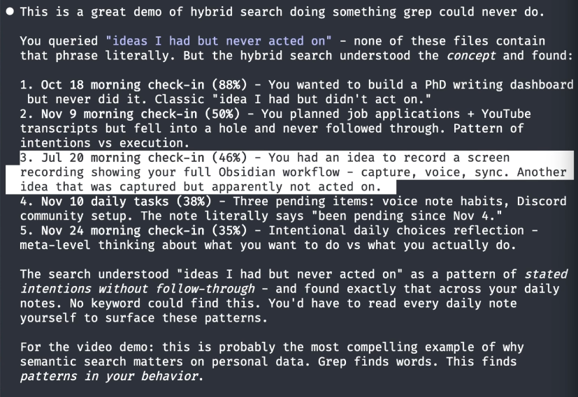 Found semantically relevant connections across months of daily notes.