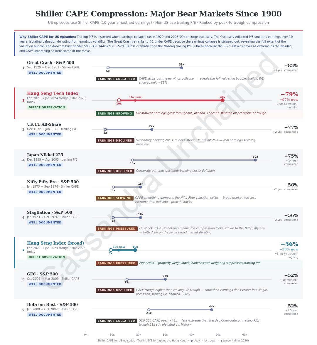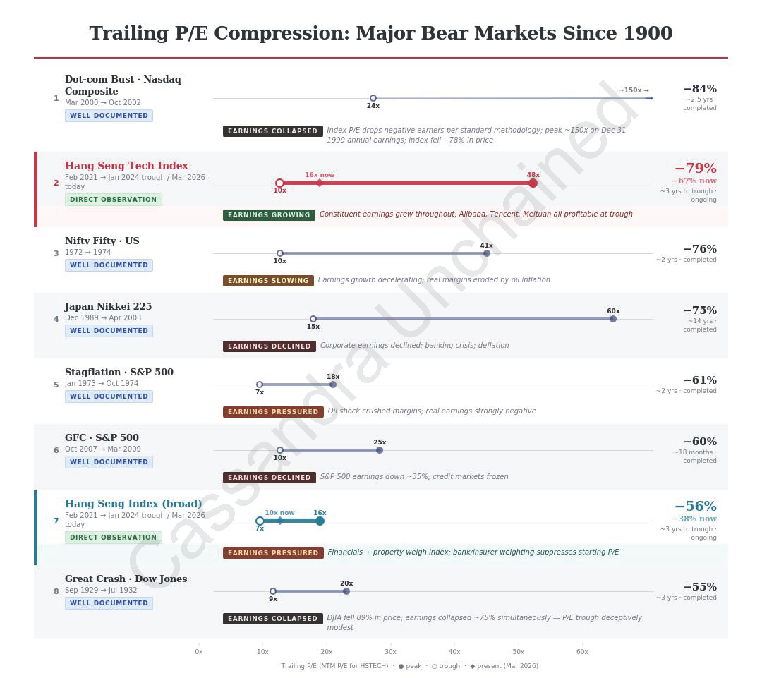 The Hang Seng Tech Index slump, now in its 5th year, ranks second or third across all manifestations of this bear market multiple compression study.