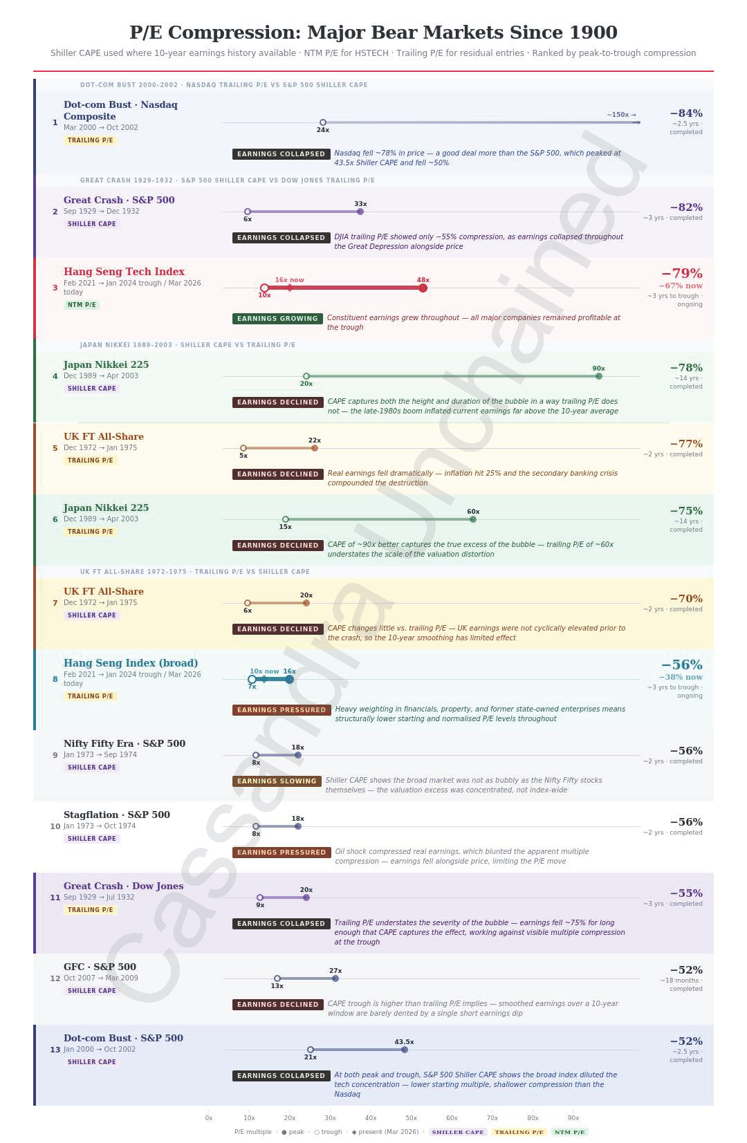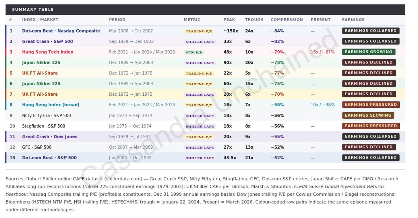 Comparing crashes is difficult, especially across long periods. In this chart, the NASDAQ tech bust is the worst in history, with a very high PE ratio at the start. Generally, the chart reveals the worst multiple compressions start from the higher PE ratios. The Hang Seng Tech Index was up there too - irrational exuberance not so very long ago.