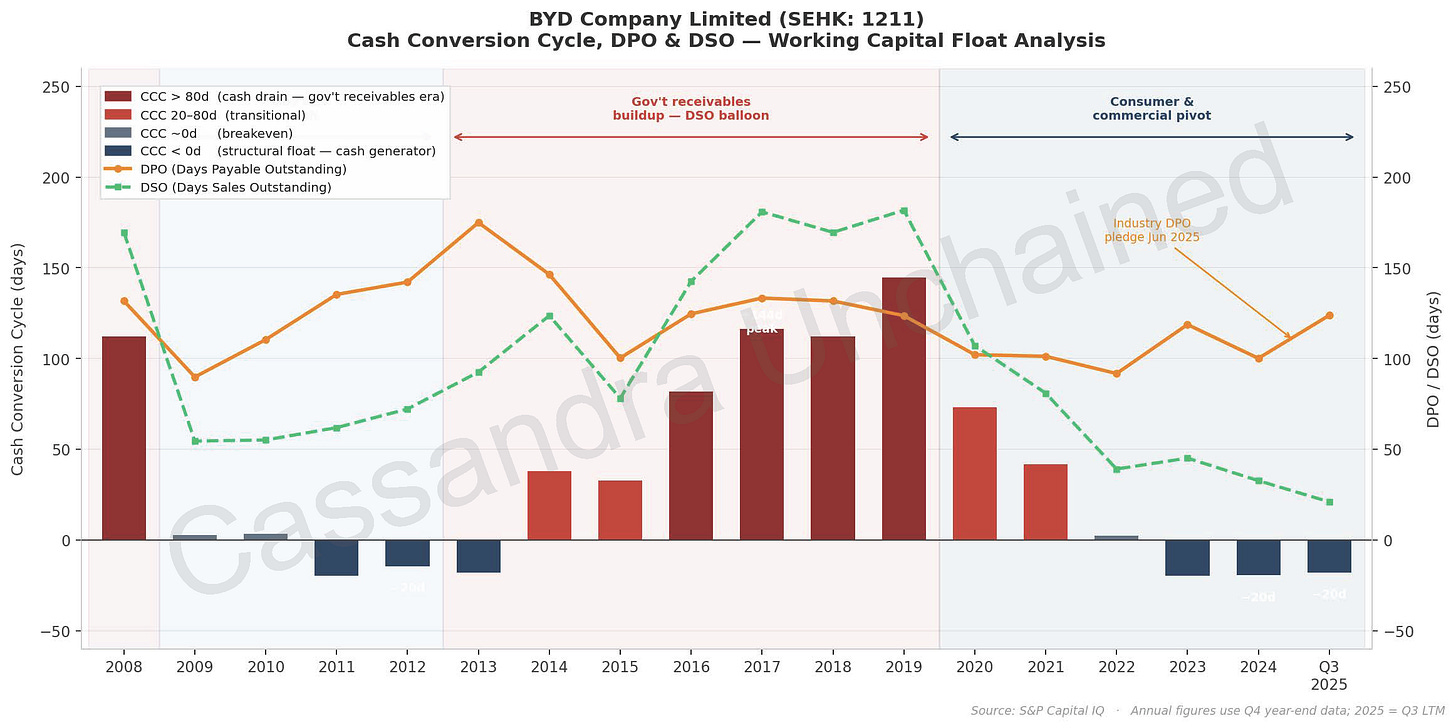 BYD showcases significant leverage with its third-party suppliers by carrying a significant float of payables (DPO is 100 days), which inflates operating cash flow. The dramatic drop in receivables days (~33 days sales outstanding or DSO) along with the expansion in payables days, as BYD moved from government to consumer/commercial, amounted to a ~$5-6 billion windfall and funded its global factory buildout to a significant degree. This may have been one of Berkshire’s key insights.