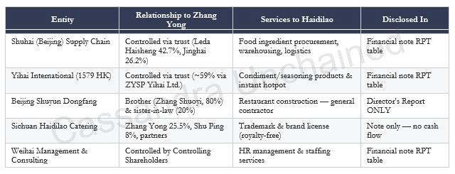 海底捞的经营业务受益于一种颇具亚洲特色的垂直整合方式。海底捞的一部分需求(装修、调味品、物流)由一套与创始人关联的“姐妹公司生态”提供。通过关联方发生的成本约占其总成本的 ~40%。 关联方交易(Related-party transactions,RPTs)在证券分析中通常当然是负面信号。