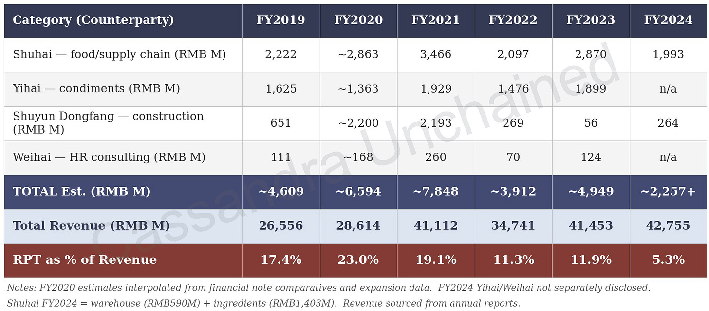 我会关注本月末发布的 2025 年年报,看看是否会进一步说明,以及是否会恢复对颐海与蜀海的付款披露。2024 年的关联方交易占营收比例大概率仍在 12% 左右或更高。我注意到,这些关联方确实提供了真实的服务与商品——问题在于定价是否接近独立第三方交易(arms-length)的水平。