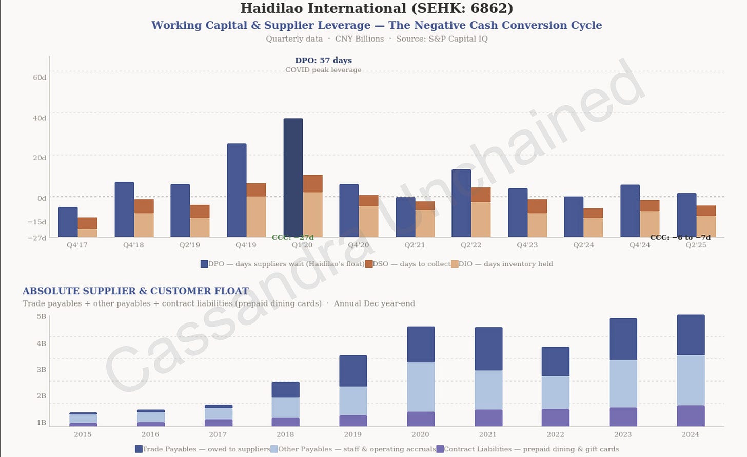 海底捞从食客处立即收取现金与信用卡付款,生鲜食材周转也快,因此公司仅持有 21 天库存,却在 37 天后才向供应商付款。注意,37 天并不异常,也不构成对供应商的压榨——它处于常见的 30–45 天标准区间。但该商业模式却能产生永久为负的现金转换周期。