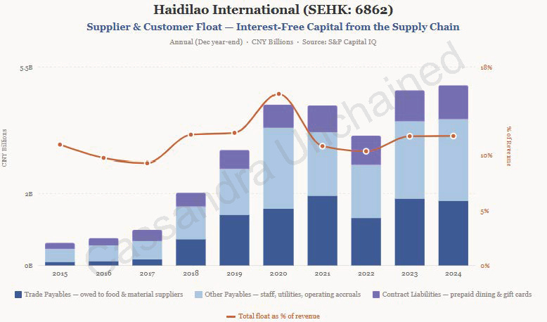 上图显示海底捞拥有约 50 亿元人民币的浮存金——一池永久的、免息资本,规模几乎相当于营收的 12%。随着海底捞增长,这一浮存金还会继续增长,因为它是商业模式的一部分。