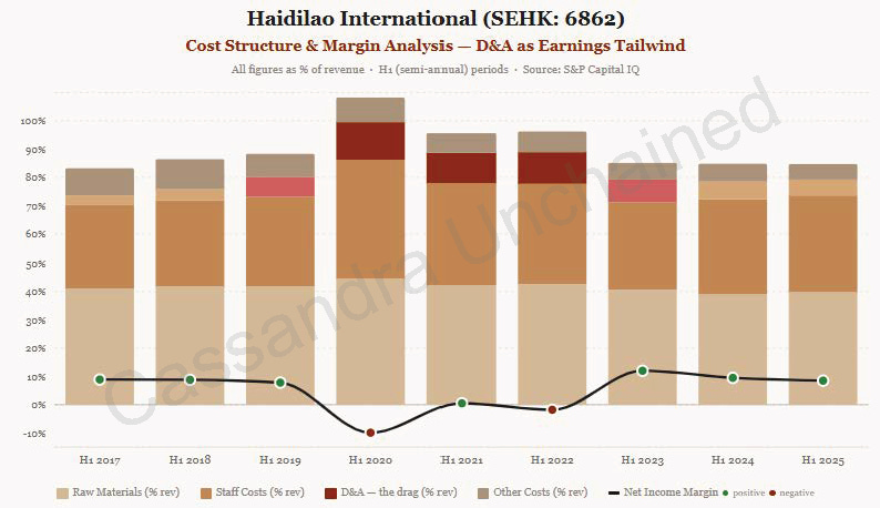 2024 年期间,管理层为了表达信心,将约 94% 的净利润以股息形式分配。按近期价格,这相当于约 6% 的股息率,且没有金融负债。海底捞几乎所有门店都为租赁,且大多数租约附带终止选项。这也是它能迅速关闭数百家门店的原因。