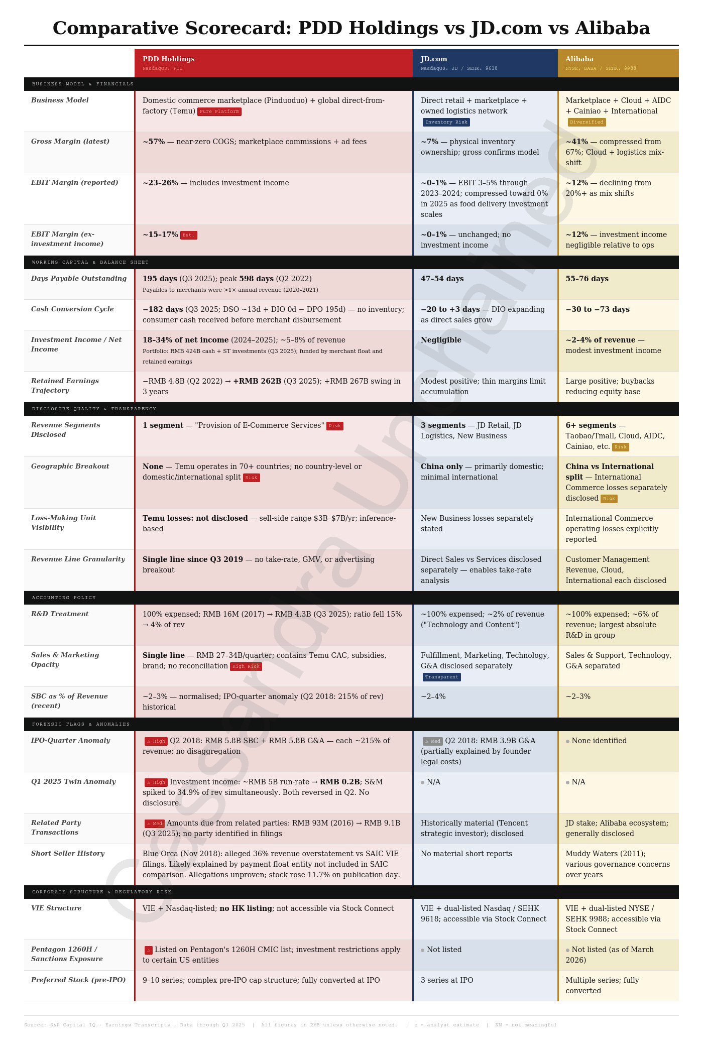 当披露出现怪异之处时,重要的是对类似公司做对照法证分析。我做法是:先审视 PDD 的潜在红旗,再用同样维度检查可比公司。下表汇总了这套对 PDD 的分析,并以京东与阿里作为对照。