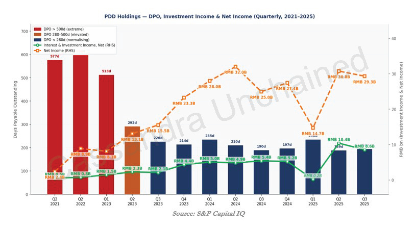 随后,PDD 将工业供应商也引入拼多多平台——而且令人惊讶的是,仍把应付账款天数维持在 500–600 天。PDD 通过把约 4200 亿元人民币(接近 600 亿美元)本该支付给商家的款项“扣住不付”,再投资于短期工具,从而赚取可观的投资收益。