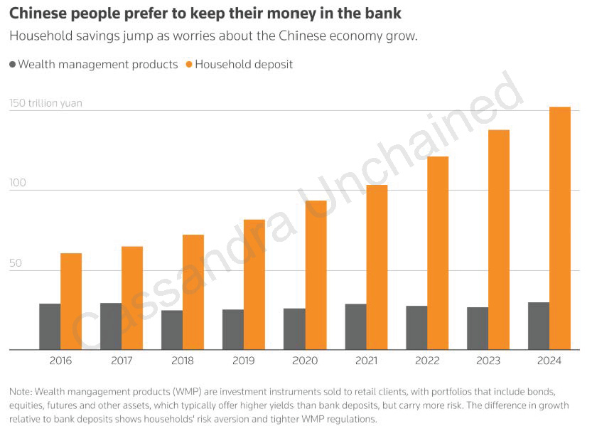 China’s COVID Zero policy led to lockdowns unlike any other country. Nightmarish scenes were filmed on phones and uploaded online. The crackdown/lockdown came in 2022, later than some other countries, but coinciding with just about everything else going wrong, as described above. Youth suicide rates doubled. In April 2022, retail sales fell 11% and industrial production crashed. Permanent damage included significant pay cuts for white collar and civil service employees alike. This triggered the already-high Chinese savings rate to spike higher still – household savings surged 81% in 2022 from 2021, directly stealing from consumption. Then, when China let up on the lockdowns, China endured an acute COVID pandemic anyway. Hundreds of millions of Chinese people caught COVID, and the hospital overload was yet another memorable nightmare that continues to suppress sentiment in the country and lead consumers to save rather than spend.