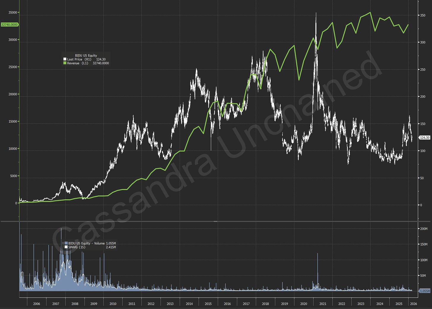 This not uncommon. Baidu IPO’d August 5, 2005 on the NASDAQ, about a year after Tencent listed in Hong Kong. Many saw it, at the time, as the Google of China – Google was relatively young then too. Baidu had a stunning run from IPO to 2018, compounding at about 20% annually. There was an ephemeral meme-fueled resurgent spike in the early 2021 frenzy, but Baidu stock today trades where it did in 2010.