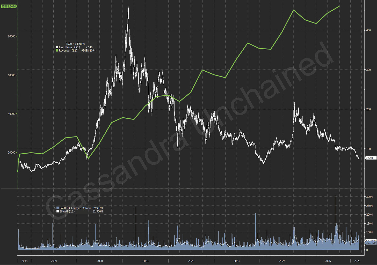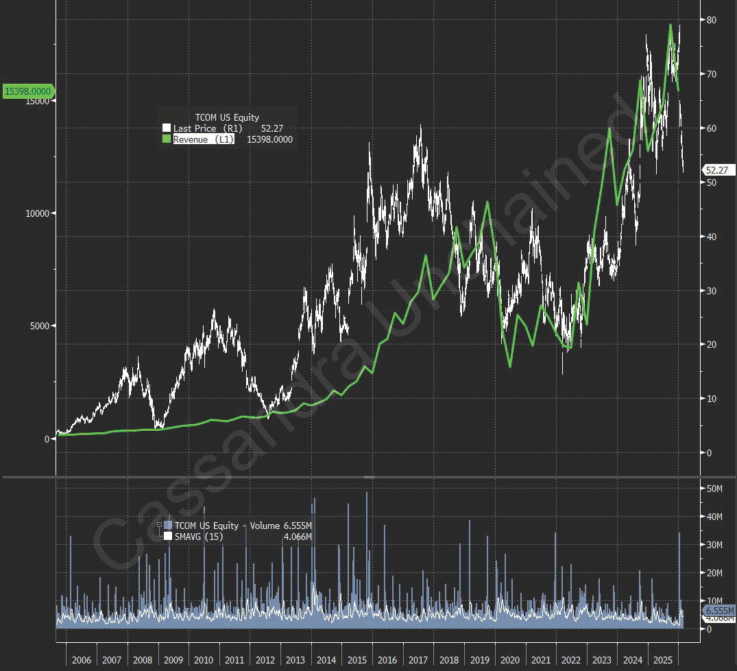 Trip.com, a Chinese online travel agency, went public in 2003 on the NASDAQ as Ctrip.com, a little earlier even than Tencent. Trip.com stock has compounded at 19.0% annually since that 2003 IPO. COVID, as we know, introduced significant volatility into the travel industry.