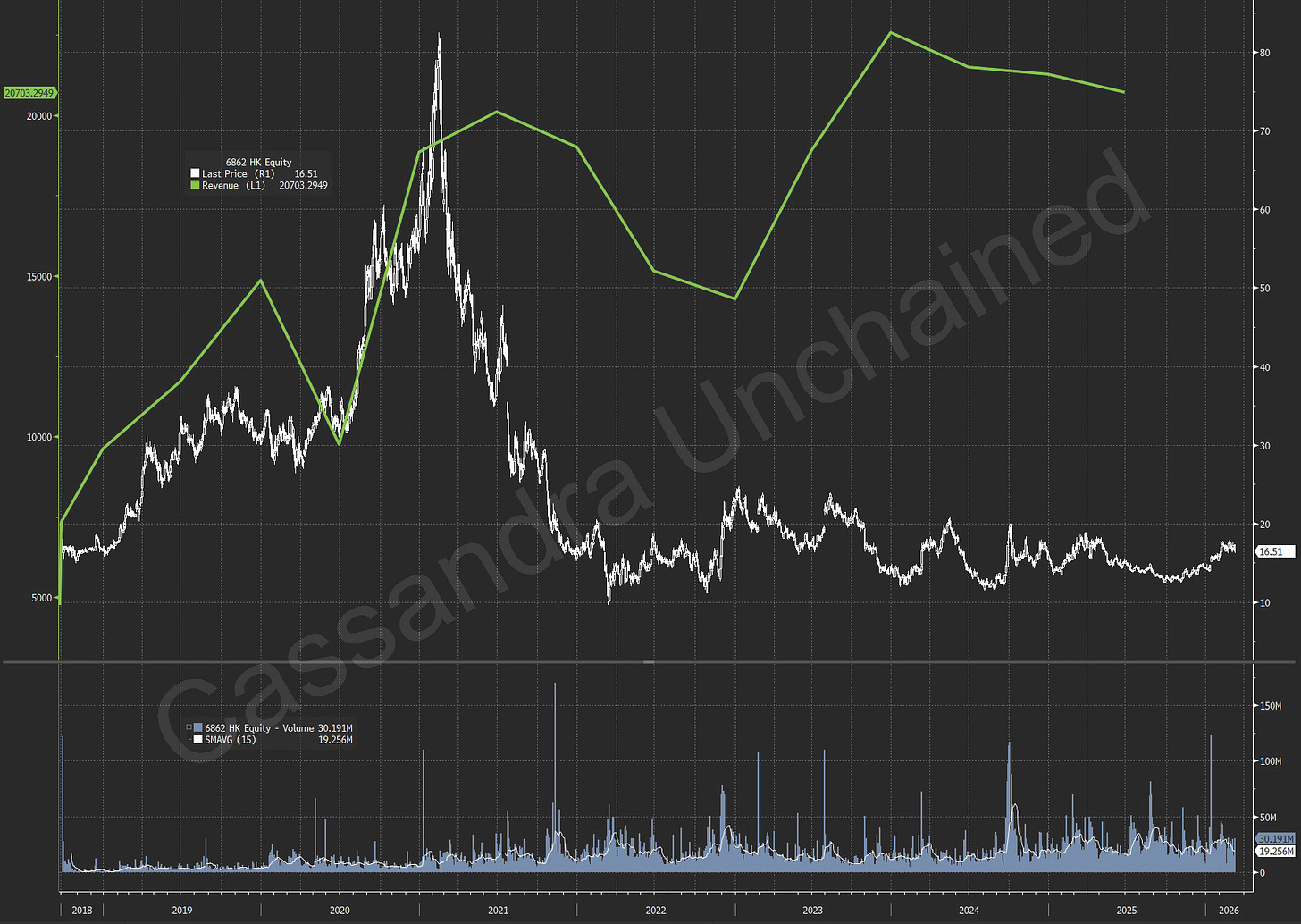 That green line is revenue. Take a look again at each chart. The reason for the terrible performance in no case involved a failing business. Quite the opposite. In almost every case revenue kept growing at a very healthy rate. For most, that revenue growth even powered through COVID, and the horrific Chinese lockdown.
