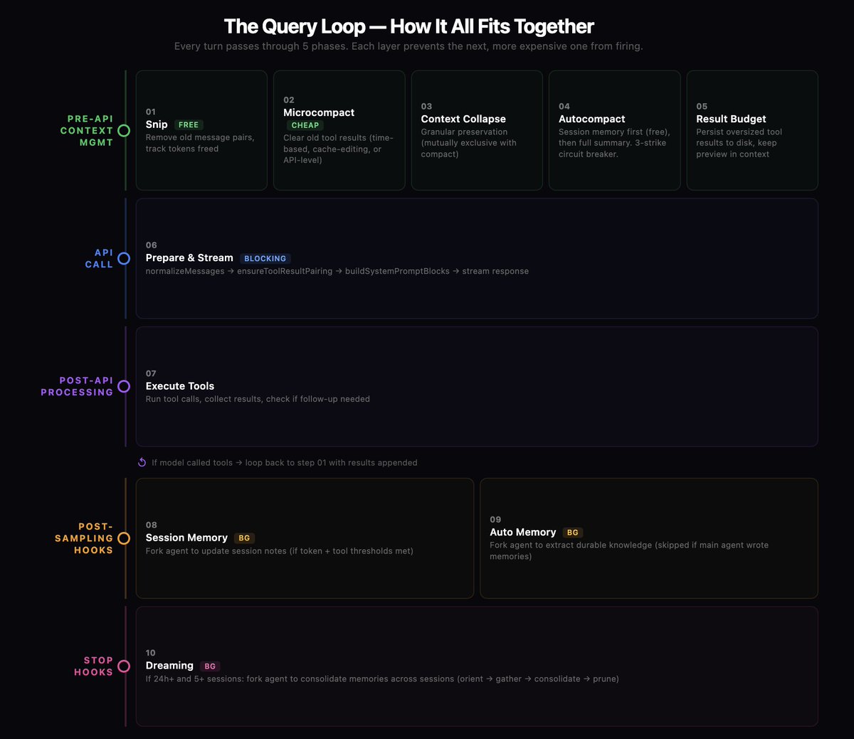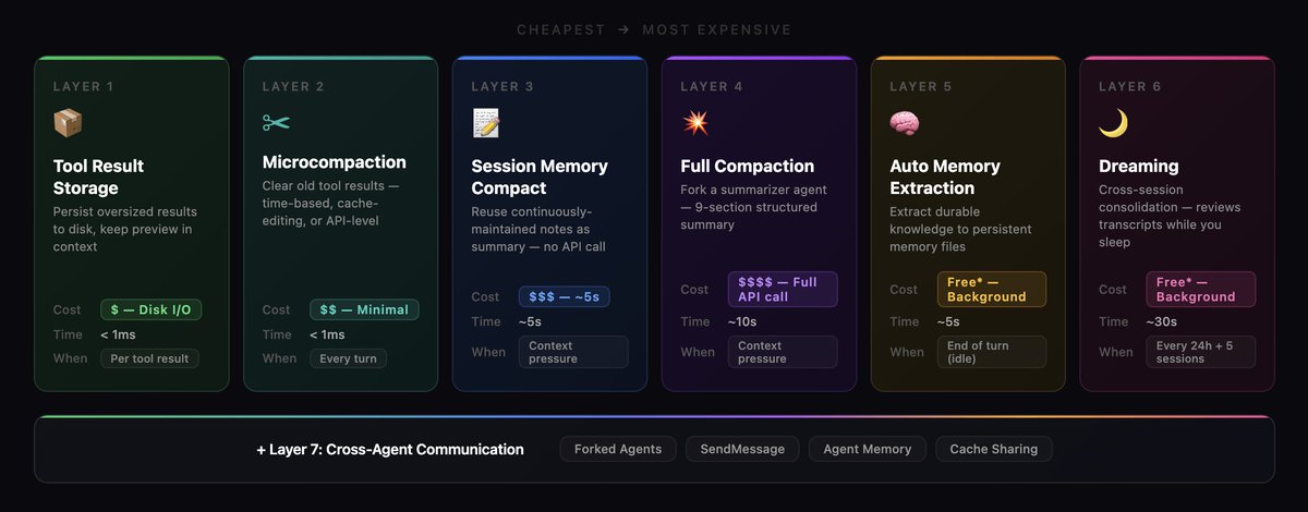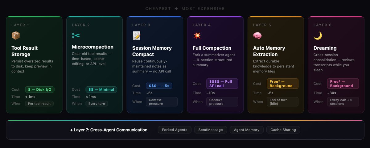 Claude Code 用一套七层记忆架构解决这个问题,跨度从亚毫秒级 token 修剪到耗时数小时的后台“梦境”整合。每一层越往后越贵,但能力也越强。整个系统的设计目标是,让更便宜的层尽量挡住更昂贵的层,不让它们被触发。