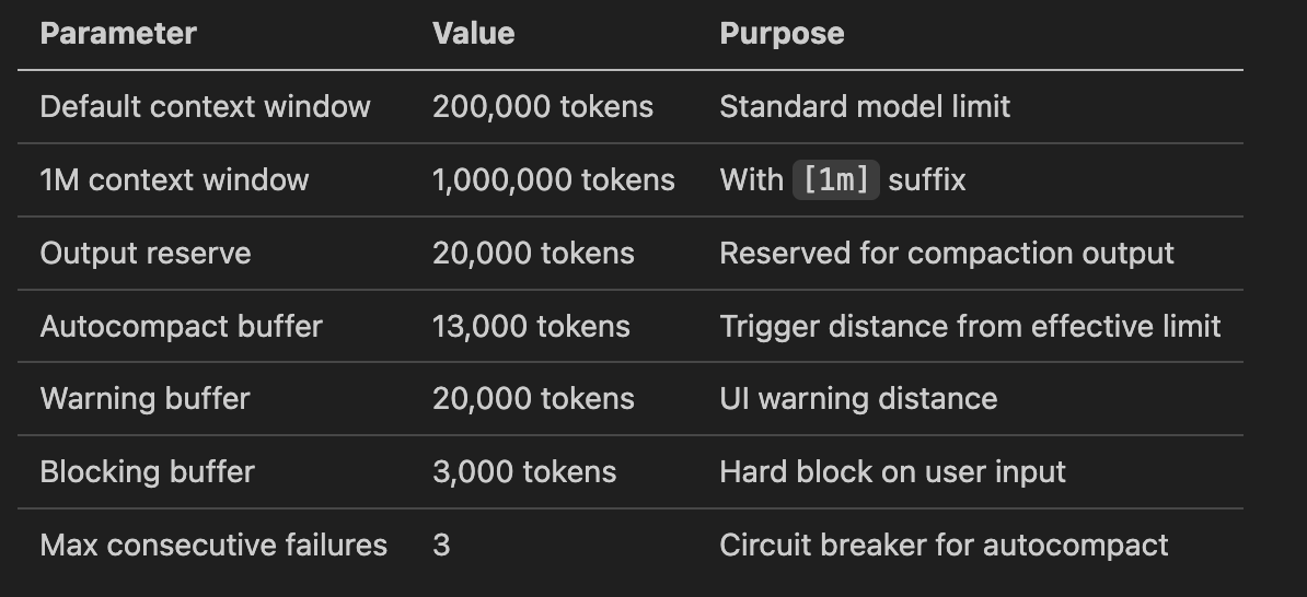有效上下文窗口会先扣掉 20K token 作为压缩输出的预留。窗口不能全用满,因为还得留位置生成那段救命的总结。