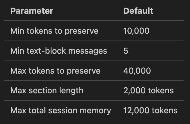 minTokens: 10_000, // Minimum tokens to preserve