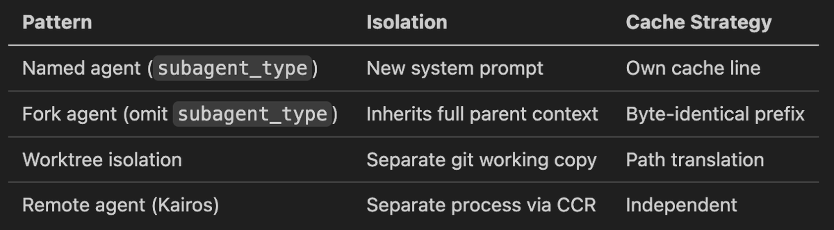 分叉代理复制可变状态来隔离(避免互相污染),同时共享 prompt cache 前缀(避免成本爆炸)。这是个微妙平衡,隔离过度会浪费缓存,共享过度会引入 bug。