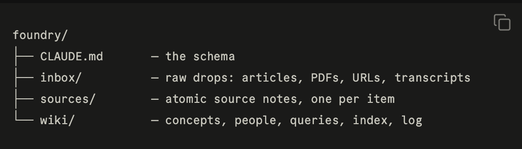 I drop things into inbox. Claude reads them and writes atomic source notes into /sources. When there are enough sources on a single theme, Claude compiles a concept page into /wiki. .
