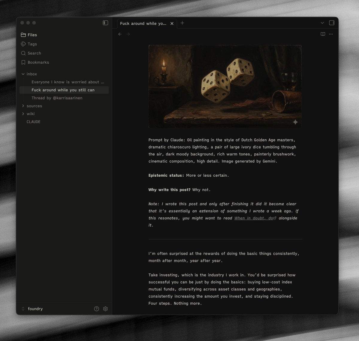 In my personal vault, I would take the time to write about one/two of these items a day - the other context from any other context is lost. I still pick a couple of articles/podcasts to write about in my personal vault, because I enjoy that process and it is valuable. But now, everything else is included in Foundry, ready to be re-surfaced as and when I need it.