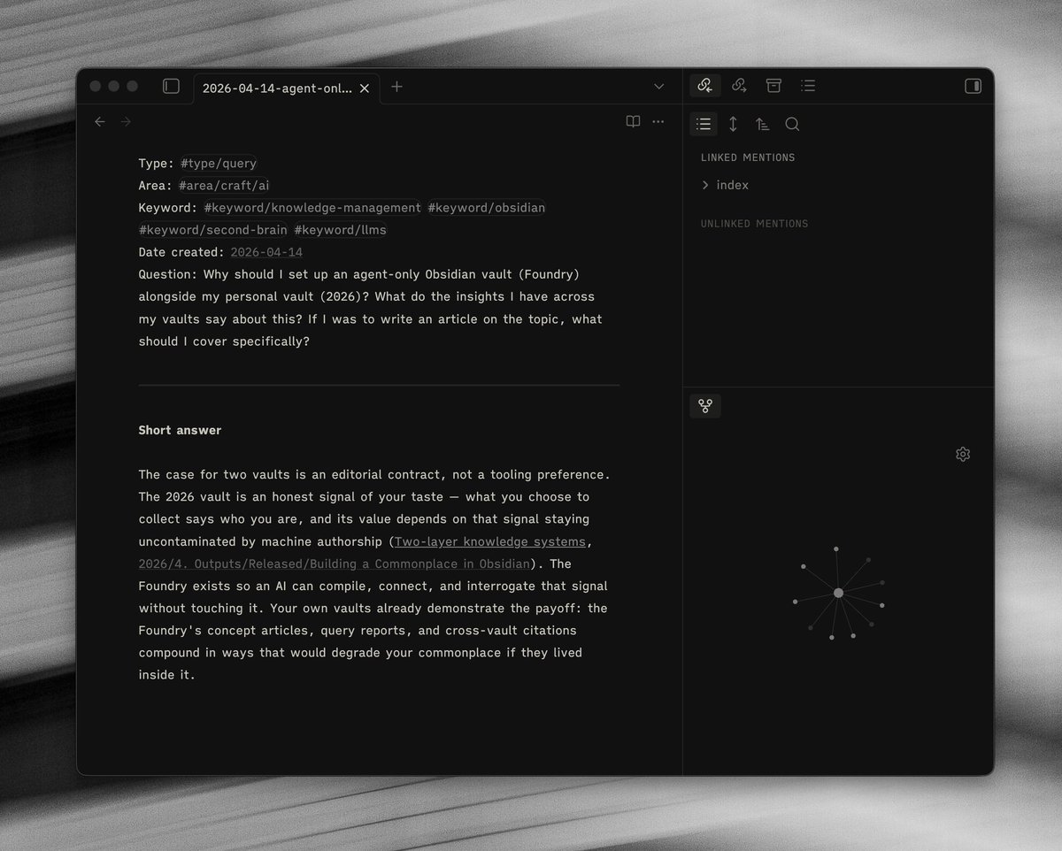 I now keep two @obsdmd vaults. One I write in (personal), and one @claudeai maintains (agent). The goal of the agent vault is to serve the personal vault, help distill my thinking and generate new ideas.