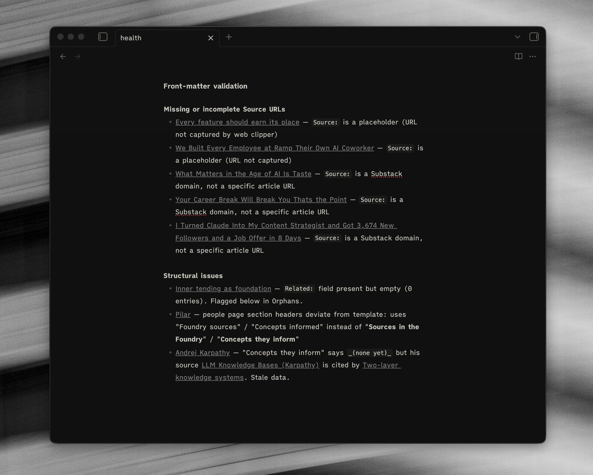/foundry-lint is a health check. Orphans, dangling links, candidates ready to compile, keyword drift. Example is the health dashboard, flagging up some structural issues the AI needs help with: