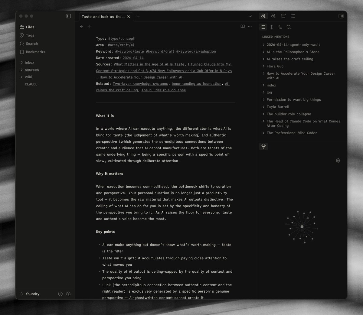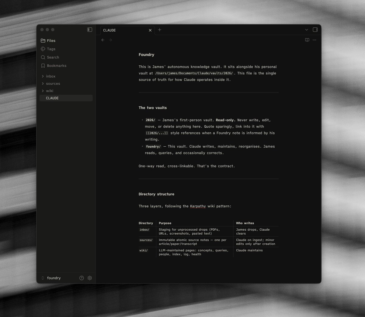 'Foundry' is the agent vault. It processes more information and forms ideas, concepts and thoughts for me to build off of. It's maintained entirely by Claude.