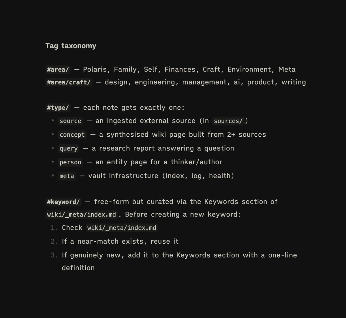 Andrej suggested a number of skills, to help process the information and the workings of the vault. Each one does one thing and has an explicit refuse list.